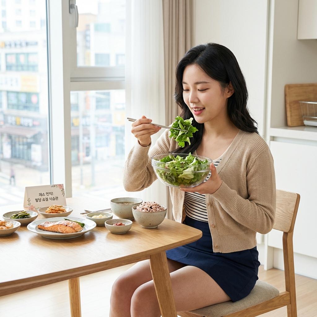 식사 순서만 바꿔도 혈당 관리에 큰 도움이 됩니다. 식이섬유가 풍부한 채소나 샐러드를 가장 먼저 드셔보세요. 채소가 위장에서 당분 흡수를 지연시켜 식후 혈당이 급격히 오르는 것을 막아줍니다. 채소 다음으로는 단백질 반찬, 마지막으로 밥(탄수화물)을 먹는 순서입니다. 같은 식단이라도 어떻게 먹느냐에 따라 결과는 달라질 수 있습니다.