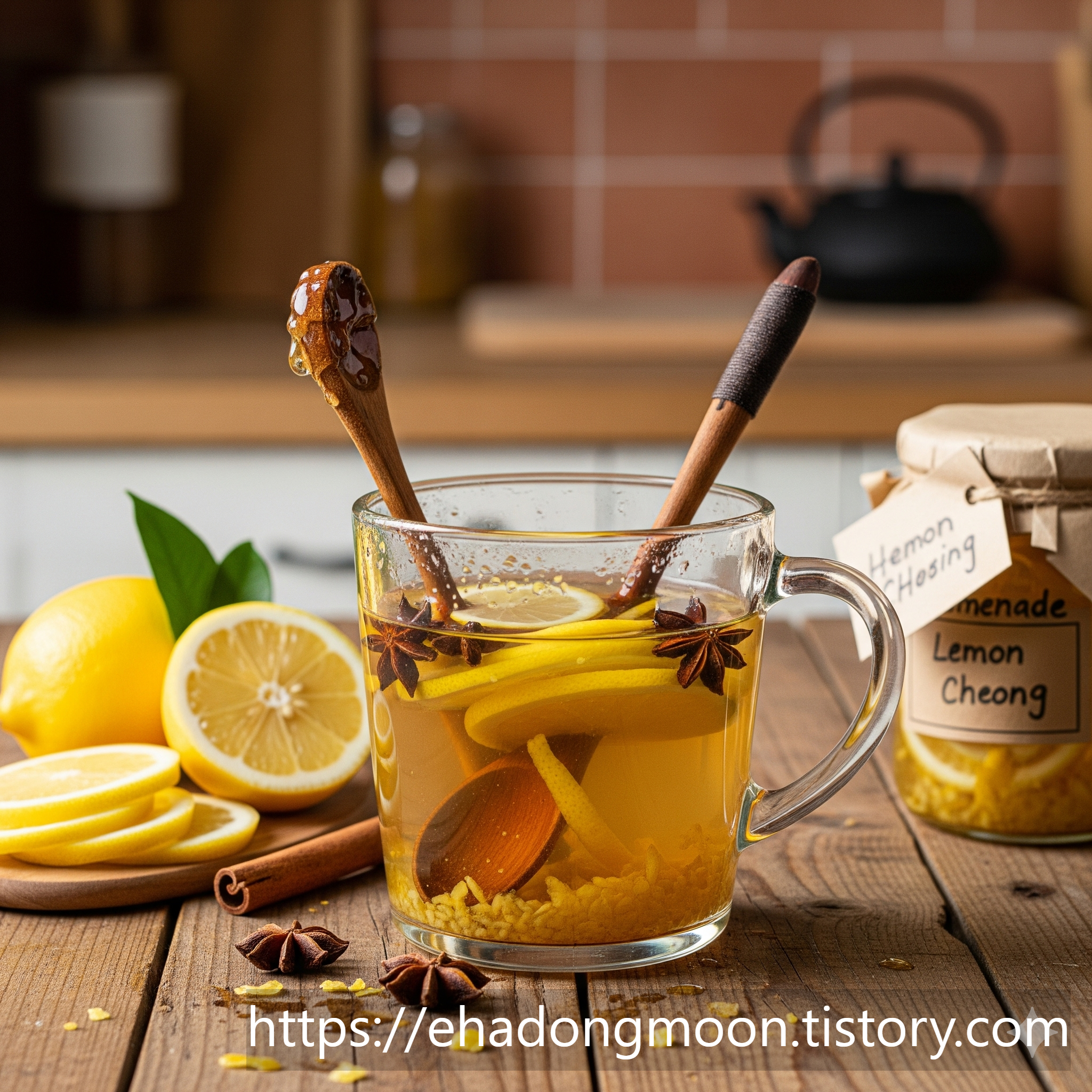 - 물과의 조화: 숙성이 끝난 이후, 2~3 큰술의 꿀 레몬청을 따뜻한 물 (40도 이하) 또는 차가운 물에 타서 잘 저어 마시면, 입안 가득 상큼한 #힐링음료로 변신합니다!