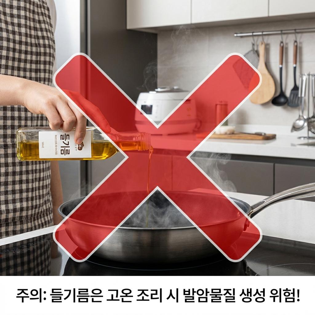 들기름을 사용할 때 가장 주의해야 할 점은 바로 '열'입니다. 들기름의 오메가-3는 열에 매우 약해서 120도 이상으로 들기름 가열 시 영양소가 파괴될 뿐만 아니라 발암물질이 생성될 수 있습니다. 따라서 볶음이나 튀김 요리에는 절대 사용하면 안 됩니다. 나물 무침이나 비빔밥처럼 조리가 끝난 음식에 마지막에 둘러 먹는 것이 가장 좋습니다. 몸에 좋은 약도 잘못 사용하면 독이 될 수 있다는 점, 꼭 기억해주세요.