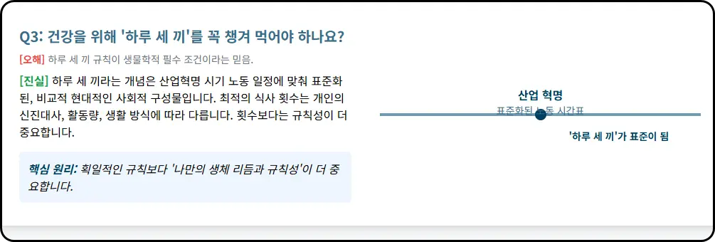 | 3. 하루 세 끼는 필수다. | '삼시세끼'는 근대 산업사회의 산물입니다. 중요한 것은 횟수가 아닌, 개인의 생활 패턴에 맞는 '규칙성'입니다. |