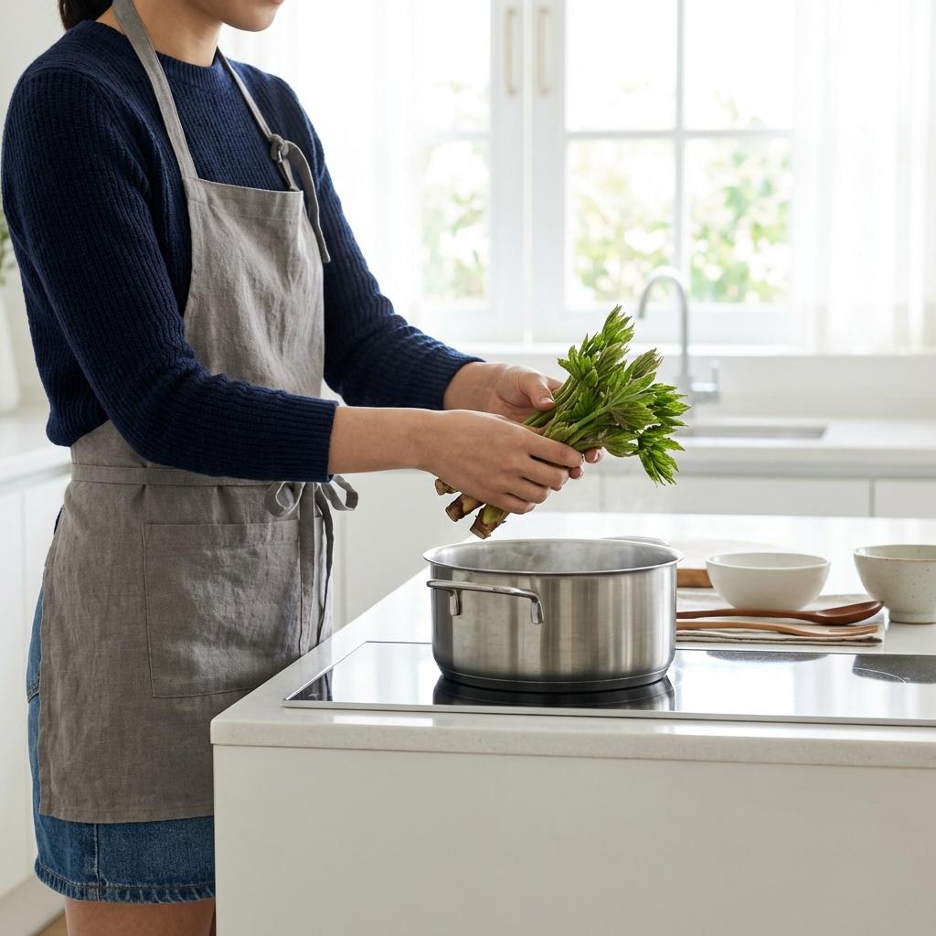 두릅은 줄기 두께에 따라 두릅 데치기 시간을 세밀하게 조절해야 합니다. 물이 팔팔 끓을 때 밑동부터 세워서 15초간 먼저 익히는 것이 핵심입니다. 그다음 전체를 담가 25초만 더 데치면 줄기는 연하고 잎은 살아있는 식감이 됩니다.