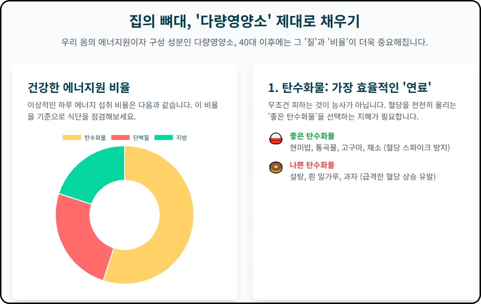 자, 그럼 이제 우리 몸이라는 집의 뼈대와 벽돌, 즉 다량영양소부터 제대로 채우는 법을 알아볼까요? 특히 우리 나이, 40대 이후에는 이 뼈대를 어떻게 관리하느냐에 따라 남은 인생의 건강이 좌우된다고 해도 과언이 아닙니다.