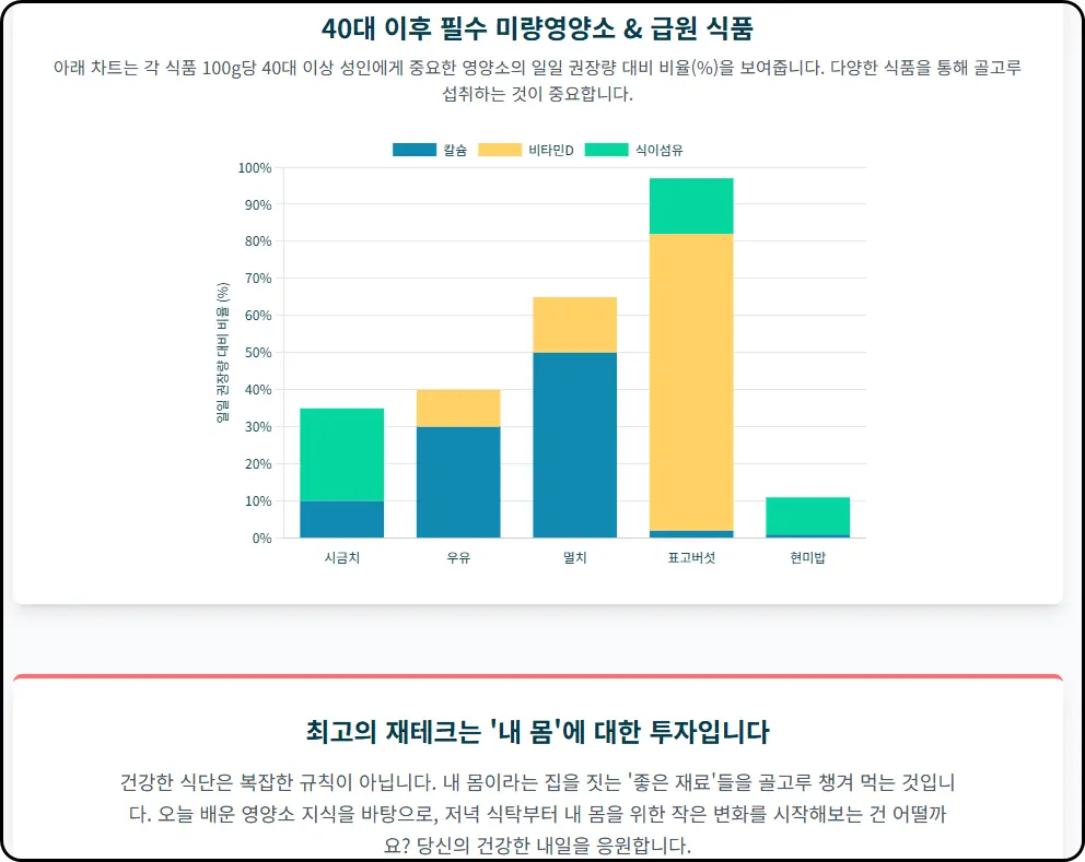 젊었을 때는 조금 부실한 재료를 써도 집이 그럭저럭 버텨주었을지 모릅니다. 하지만 40, 50, 60대를 지나는 우리 집은 이제 세심한 보수와 관리가 필요합니다. 기둥(단백질)이 약해지지 않도록 튼튼하게 보강하고, 뼈대(칼슘, 비타민D)가 부식되지 않도록 꼼꼼히 점검하며, 배선과 수도관(각종 비타민, 미네랄)이 막히지 않도록 깨끗하게 관리해야 합니다.