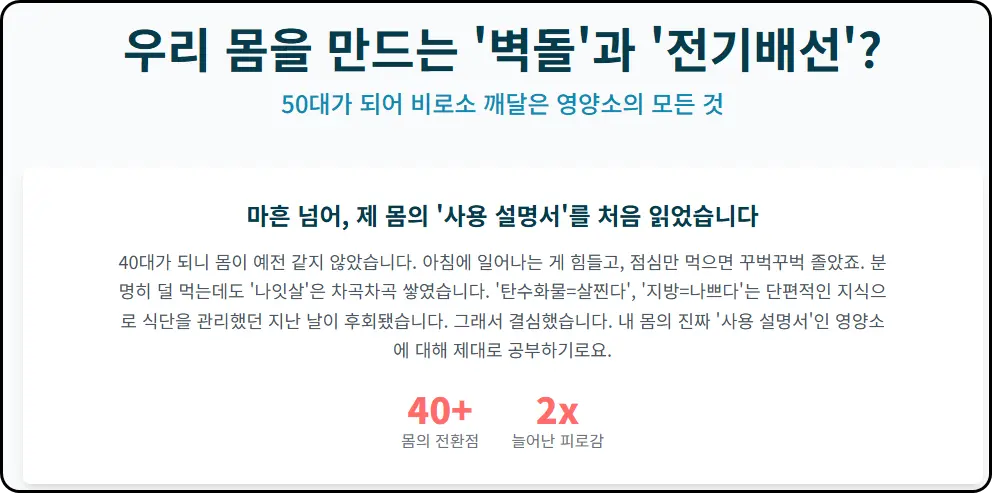 오늘은 그때 제가 깨달았던, 그리고 지난 10년간 꾸준히 실천하며 확신하게 된 영양소에 대한 이야기를, 제 또래 친구분들에게 아주 쉬운 비유로 들려드리려 합니다.