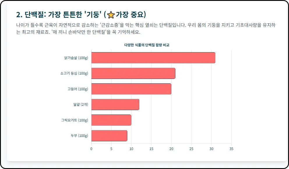 | 구분 | 추천 식품 | 100g당 단백질 함량 (약) |