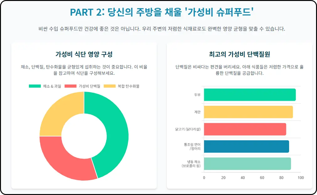 '슈퍼푸드'라고 하면 보통 아보카도, 퀴노아, 치아시드처럼 비싸고 이국적인 식재료를 떠올리기 쉽습니다. 하지만 진짜 슈퍼푸드는 화려한 마케팅이 아닌, 저렴한 가격에 최고의 영양을 담고 있는 우리 주변의 평범한 식재료들입니다. 이제부터 당신의 주방을 든든하게 채워줄, 만원으로도 충분히 즐길 수 있는 진짜 '가성비 슈퍼푸드'들을 소개합니다.