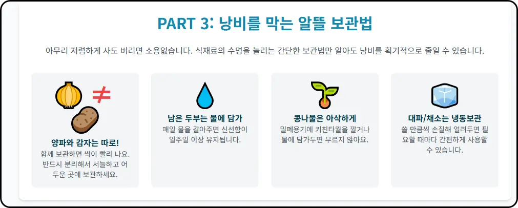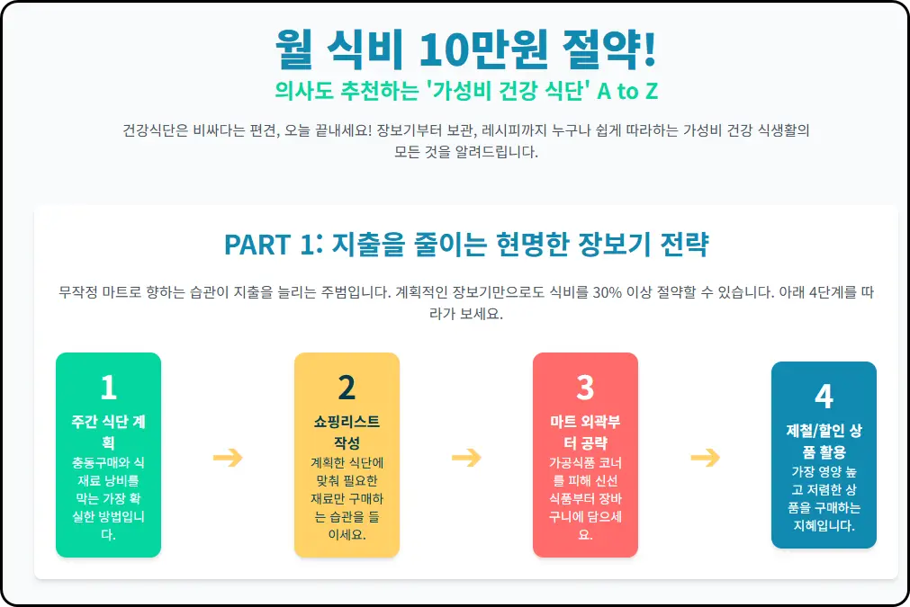 '건강=비용'이라는 편견을 이제 과감히 버리세요. 오늘 소개해드린 수많은 팁 중에서 단 하나라도 좋습니다. 이번 주에는 쇼핑리스트를 작성해보거나, 대파를 썰어 냉동해보거나, 감자 계란국을 끓여보는 것처럼 작은 실천부터 시작해보는 것은 어떨까요?
