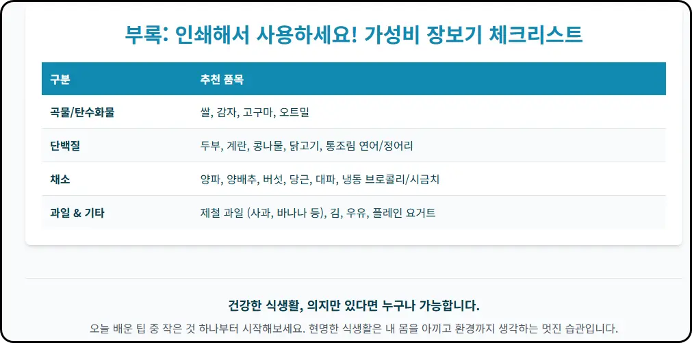 이 체크리스트를 인쇄하거나 휴대폰에 저장해두고 장보러 갈 때 활용해보세요. 당신의 현명한 소비를 도와줄 든든한 가이드가 될 것입니다.